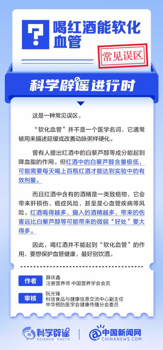 “軟化血管”通常被用來描述延緩或改善動脈粥樣硬化。曾有人提出紅酒中的白藜蘆醇等成分能起到降血脂的作用。但紅酒中的白藜蘆醇含量極低,可能需要每天喝上百瓶紅酒才能達到實驗中的有效劑量。且酒精是一類致癌物,它會帶來肝損傷、癌症風險,甚至是心血管疾病等風險。攝入的酒精越多,帶來的傷害遠比白藜蘆醇等可能帶來的微弱“好處”要大得多。