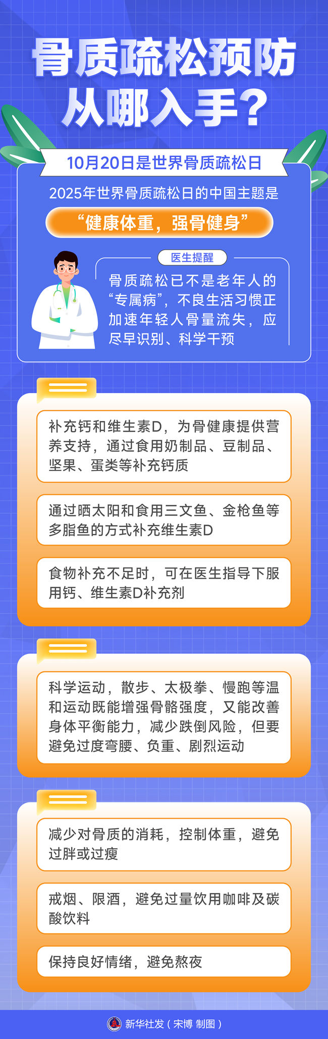 10月20日是世界骨質疏鬆日。2025年世界骨質疏鬆日的中國主題是“健康體重,強骨健身”。醫生提醒,骨質疏鬆已不是老年人的“專屬病”,不良生活習慣正加速年輕人骨量流失,應盡早識別、科學干預。