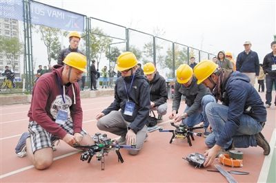 参赛选手在调试无人机。(图片来源:北京理工大学林德福、郭强/科技日报)