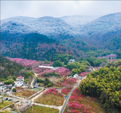 安徽芜湖市繁昌区峨山镇城东村,这里曾有一处废弃矿山。当地开展生态修复和经济林种植,在改善生态环境的同时,农文旅融合发展乡村旅游,带动村民致富,助力乡村全面振兴。图为修复后的山坡上红梅绽放。